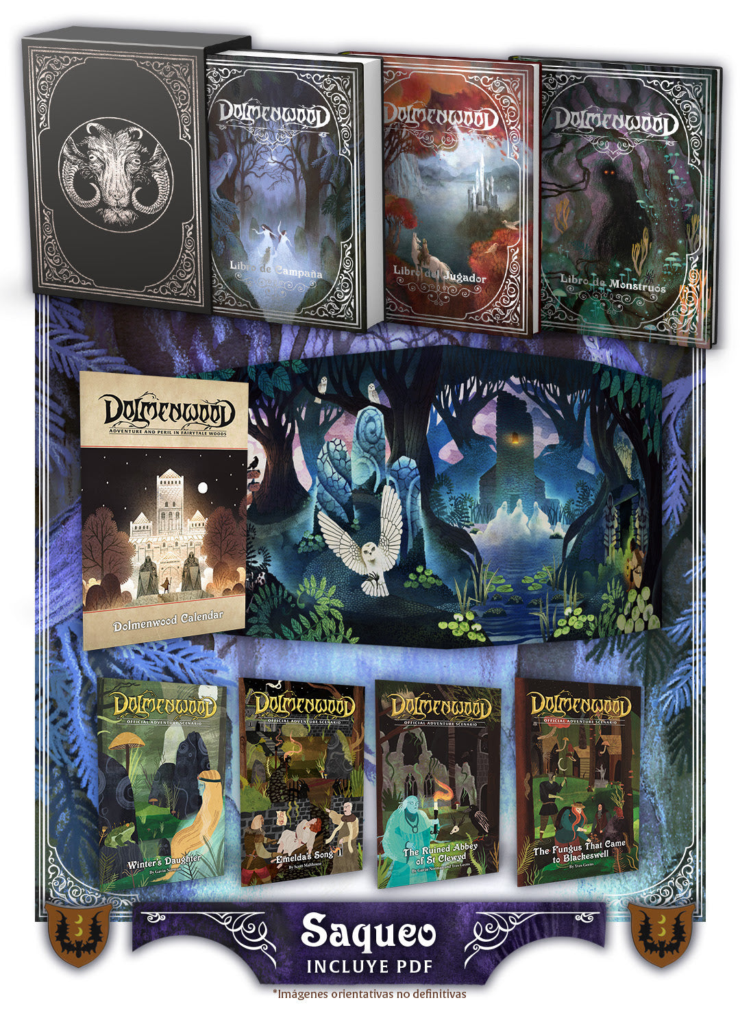Libro del Jugador edición limitada, Libro de Campaña edición limitada y Libro de Monstruos edición limitada en formato físico y digital. Estuche de cartón rígido para guardar los tres libros de edición limitada. Pantalla del Árbitro. Cuatro aventuras en formato físico y digital: La Canción de Emelda, El Hongo que Llegó a Blackeswell, La Abadía en Ruinas de San Clewyd y La Hija del Invierno. Calendario en formato físico. Todas las metas desbloqueadas en formato físico y digital. Tu nombre como mecenas del Nivel Saqueo.