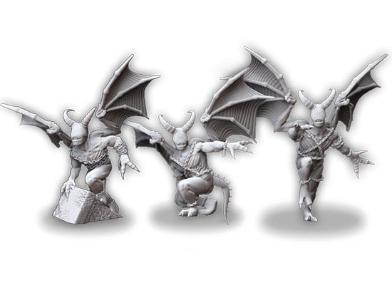 Tres miniaturas en metal de criaturas de los Mitos de Achtung! Cthulhu a escala 28mm: Los ángeles descarnados son gárgolas cornudas que carecen de rostro, pero tienen una gruesa piel oscura.