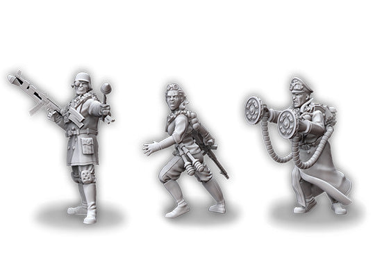 Tres miniaturas en metal de los miembros de Nachtwölfe a escala 28mm: El pack se compone de un acechador, un especialista y un jefe de fuerza de Nachtwölfe.