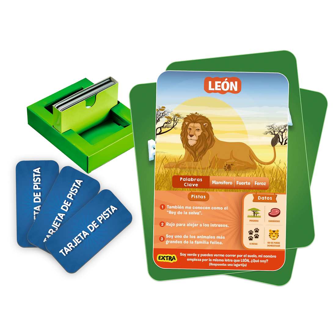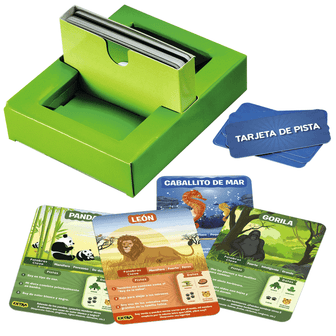 Hasta 10 preguntas para adivinar el animal de la Tarjeta de Juego. ¿Es carnívoro? ¿Es un animal doméstico? ¿Vive en grupo? Piensa bien, haz preguntas inteligentes, utiliza las tarjetas de pista y ¡sé el primero en conseguir las 7 tarjetas!