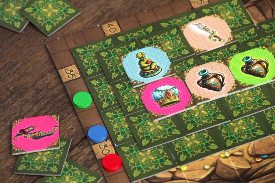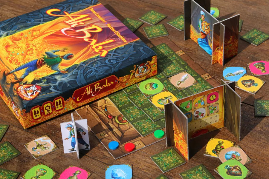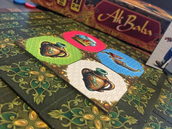 In Ali Baba, you want to collect treasures from the cave of the forty thieves. Each turn you take one of of the open tiles on the game board. After taking a tile, some new tiles can become available. The background color of each tile corresponds with a special effect, and you can use these effects to outsmart your opponents! The more treasures of the same kind you have at the end of the game, the more points you score. Become the most wealthy player to win!