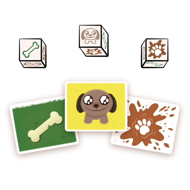 ¡A jugar! ¡Mete los dados en el cubilete Perrete, agítalo y lanza los dados!