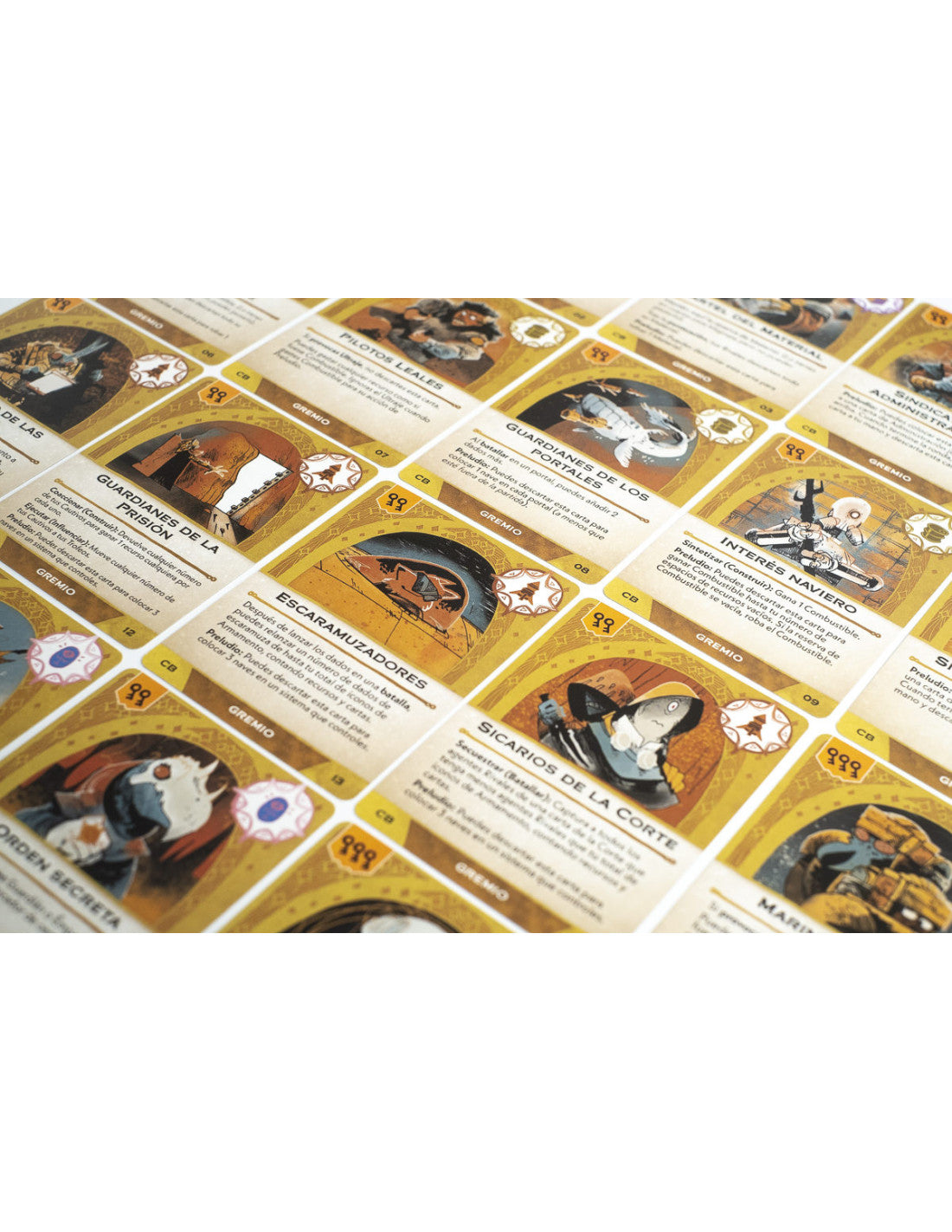 Cada juego incluye cien barcos y agentes de madera, 18 dados personalizados grabados, un hermoso tablero de seis paneles y una gran cantidad de cartas con más de 60 ilustraciones únicas.