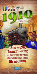 Todos a bordo para una nueva aventura a través del continente norteamericano. Si estás listo para viajar, esta emocionante nueva expansión está preparada para llamar de nuevo a los ¡Aventureros al Tren! ¡Aventureros al Tren! USA 1910 es una nueva expansión de cartas para el ¡Aventureros al Tren! original. Consiste en 181 cartas en el nuevo formato más grande (el mismo tamaño que en ¡Aventureros al Tren! Europa), que incluyen: 35 nuevos Billetes de Destino, una nueva carta de bonificación GlobeTrotter por ser el que completa más Billetes y una baraja completa para reemplazar la baraja original del juego. Incluye además un nuevo libreto de reglas que ofrece a los jugadores tres nuevas formas de jugar: usando sólo los nuevos Billetes de Destino: el Mega Juego, incluyendo todos los Billetes; y las Grandes Ciudades, que utiliza sólo Billetes de largo recorrido.