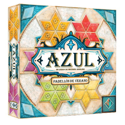 En Azul Pabellón de Verano, los jugadores tienen la tarea de construir los pisos de la obra maestra sin construir del Rey. Usando la misma mecánica de selección de la serie Azul, los jugadores deben seleccionar cuidadosamente los materiales más bellos y evitar el despilfarro de suministros. Sólo los mejores artesanos estarán a la altura del desafío.