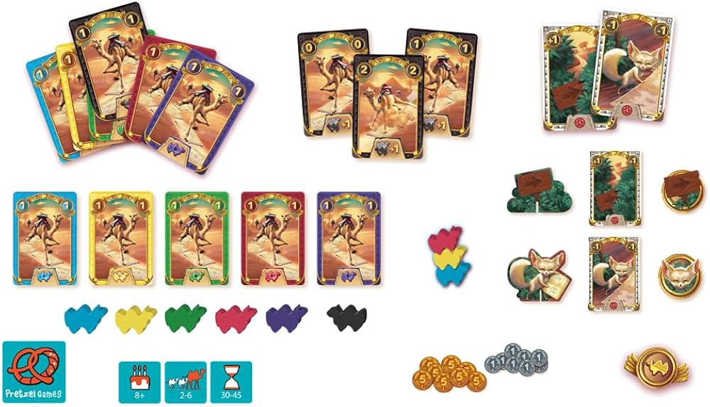 Esta nueva versión mejorada del juego incluye una pirámide de plástico muy resistente, un tablero precioso con una palmera en 3 dimensiones que te hará sumergirte de lleno en esta carrera por el desierto y nuevas reglas, como los 2 camellos corredores que se han equivocado de dirección y están corriendo en la dirección opuesta, estorbando a los demás.