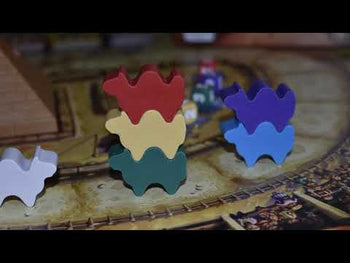 Contenido: • 1 Tablero con palmera en 3D • 1 Pirámide de plástico • 5 Camellos de madera (corredores) • 2 Camellos de madera (camellos locos) • 5 Dados personalizados • 1 Dado gris • 40 Cartas de Apuesta • 8 Cartas de Socio • 20 Tarjetas de Apuesta de Etapa • 5 Fichas de Pirámide • 8 Fichas de Espectador • 80 Monedas • 1 Marcador de Jugador Inicial de Etapa