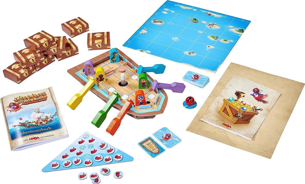 CONTENIDO: 1 libro de aventuras, cuaderno de tesoros, barco “Melody” formado por 2 piezas, 1 mapa del tesoro, tablero de recompensas, 15 fichas de ala hacia arriba, 1 reloj de arena, 5 figuras de tripulación, 5 remos, 1 bola Capitán Pepe, 1 base para la bola, 1 sobre, 8 cofres con tesoros, cartas Legacy y 1 instrucciones del juego.