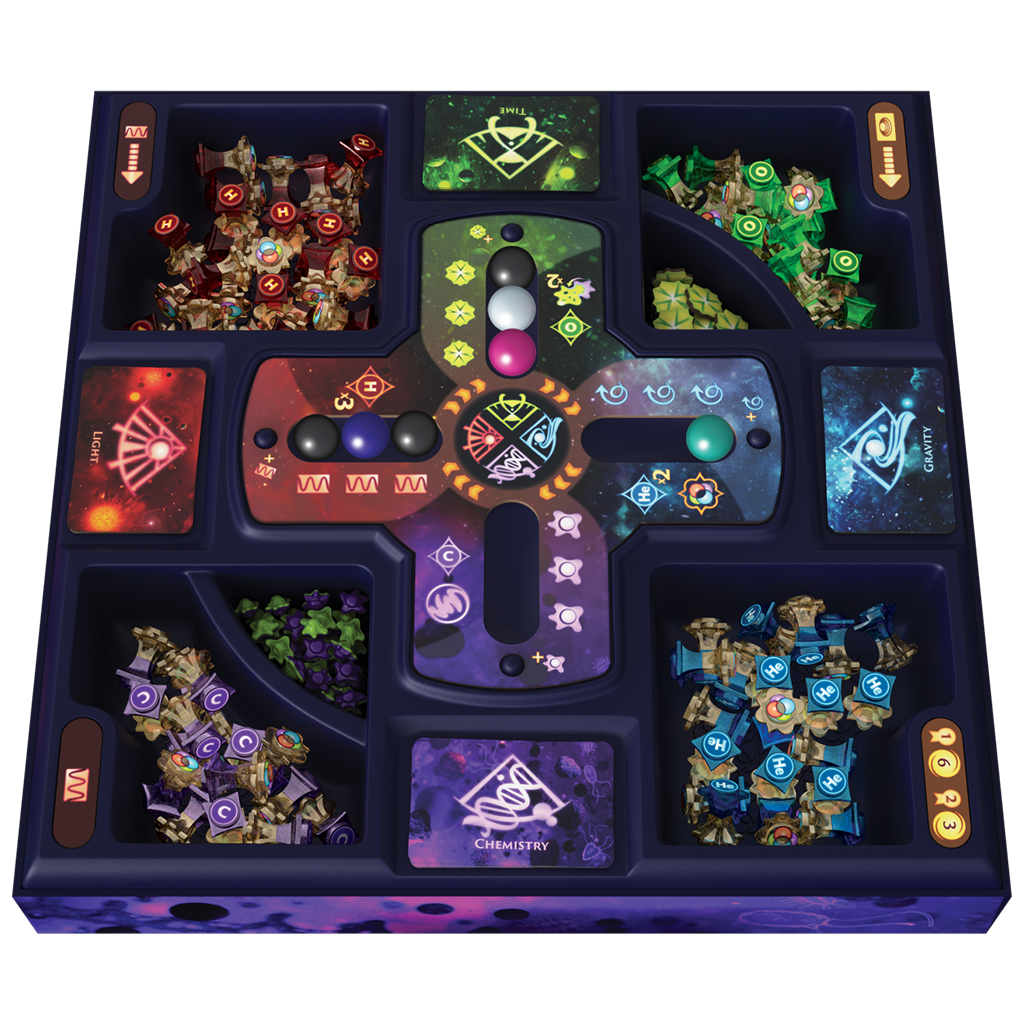 de hidrógeno, 20 fichas de Estrella de helio, 16 fichas de Estrella de oxígeno, 16 fichas de Estrella de carbono, 1 reglamento, 50 fichas de Vida, 18 fichas de Cristal de tiempo, 12 marcadores de Recursos, 16 fichas de Poder, 48 discos de Nebulosa, 24 fichas de Vida avanzada, 4 fichas de +50/100 puntos, 4 marcadores de Fin de turno, 2 soportes de cartas