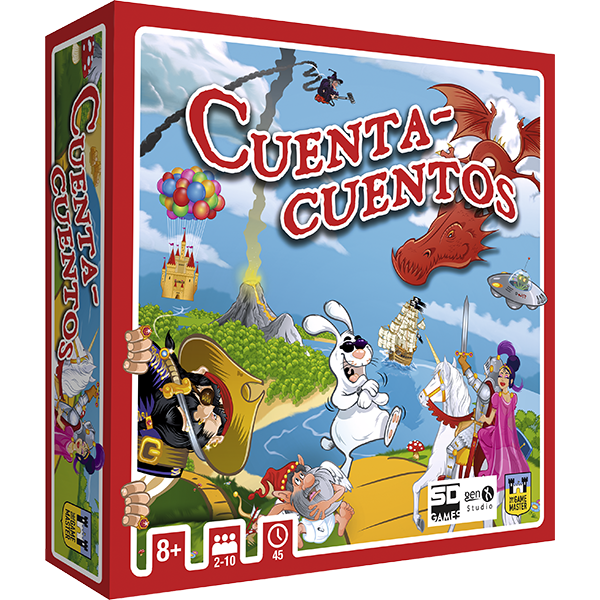 Contenidos: 1 tablero del juego, 1 plataforma giratoria, 1 camino para confeccionar combinando 4 partes, impresas en ambos lados. De 0 a 33 casillas (camino amarillo) y de 0 a 44 casillas (camino azul para jugadores experimentados), 4 figuras de juego (2 conejitos, 1 pirata y 1 princesa) + 4 peanas, 110 cartas de juego: 84 cartas de historia (4×21), 11 cartas de fin de la historia, 5 cartas de pistas, 5 cartas de resumen con un sumario de las reglas y 5 cartas con 11 posibles finales, 1 libreta; para compartir entre el CUENTACUENTOS y los demás jugadores, 2 lápices, 8 marcadores: 4 azules 4 rojos, 1 figura de conejito para llevar el conteo de los turnos, 1 listón de apuesta y 4 bolsas zip