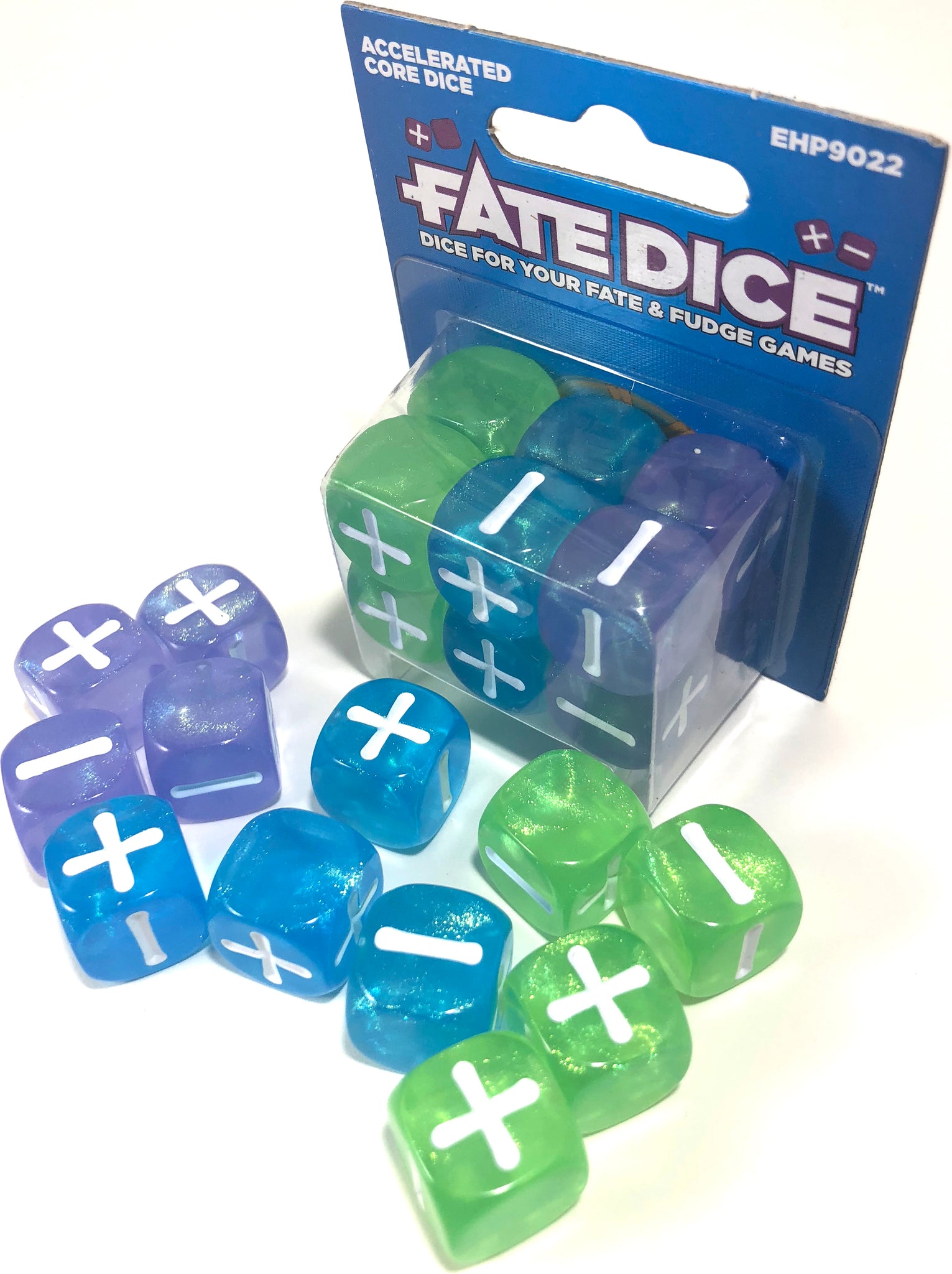 Add color and excitement to your Fate and Fudge games with Fate Dice™! Fate Dice™ are a premium line of Fudge Dice. We’ve gotten right down into the details and rethought everything about Fudge Dice. We’ve made the symbols larger and wider, so they’re easier to read. We’ve given the symbols more personality than before, with rounded, flared ends and a gentle curve expressed throughout the stroke. We’re using materials and color combinations that have never been on the market before for Fudge Dice.