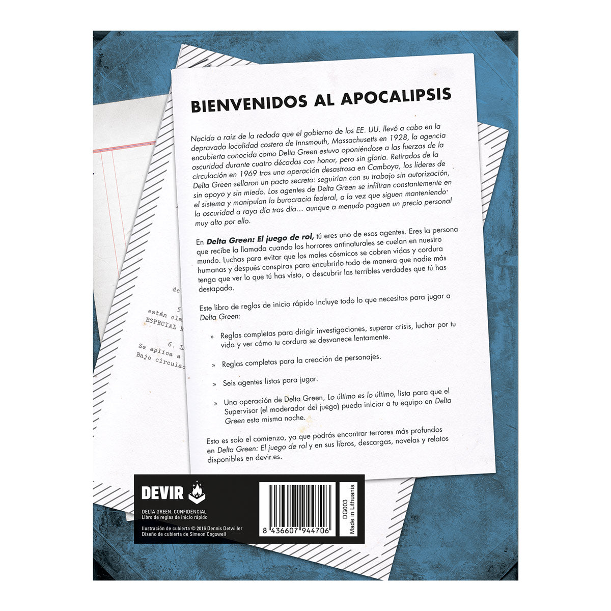 Nacida a raíz de la redada que el gobierno de los EE. UU. llevó a cabo en la depravada localidad costera de Innsmouth, Massachusetts en 1928, la agencia encubierta conocida como Delta Green estuvo oponiéndose a las fuerzas de la oscuridad durante cuatro décadas con honor, pero sin gloria. Retirados de la circulación en 1969 tras una operación desastrosa en Camboya, los líderes de Delta Green sellaron un pacto secreto: seguirían con su trabajo sin autorización, sin apoyo y sin miedo. Los agentes de Delta Green se infiltran constantemente en el sistema y manipulan la burocracia federal, a la vez que siguen manteniendo la oscuridad a raya día tras día… aunque a menudo paguen un precio personal muy alto por ello.