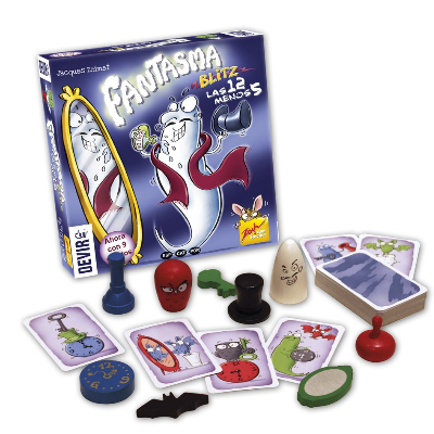 El clásico juego Fantasma Blitz vuelve de nuevo con una variante más difícil todavía! En el juego original, teníamos cinco objetos diferentes n la mesa. En esta ocasión nos encontramos con nueve objetos, en cinco colores distintos. Cada turno, se revela una carta que muestra tres de esos objetos, y los jugadores deben ser los más rápidos en tomar el objeto que no coincide ni en forma ni en color con ninguno de los que aparecen en la carta. A menos que: Un objeto de la carta coincida con uno de los de la mesa, en cuyo caso debes tomar ese objeto. Si aparece un búho en la carta, debes nombrar el objeto, en vez de tomarlo. Si aparece un fantasma con un reloj, debes decir la hora del reloj, en vez de hacer cualquier otra cosa. Si aparece un espejo mágico, no se aplica ninguna otra regla, y hay que tomar el objeto reflejado en el espejo. Cuando se acaban las cartas, el que haya reunido más será el ganador.