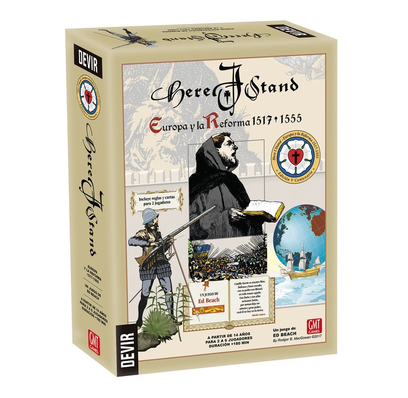 Here I Stand es un juego diplomático y estratégico para 2-6 jugadores en el que los jugadores adoptan el papel de líderes como Lutero, el Papa, Carlos V o Enrique VIII y tratan de obtener sus objetivos particulares a lo largo de casi cuarenta años (1517-1555)