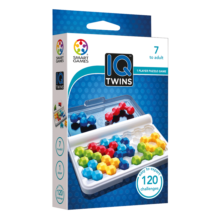 IQ Twins desafía a los jugadores a colocar 10 piezas (5 pares) en el tablero de juego. Pero cuidado: ¡los gemelos no son idénticos! Unas piezas solo caben en ángulos de 90°, mientras que sus gemelos encajan a 45°.