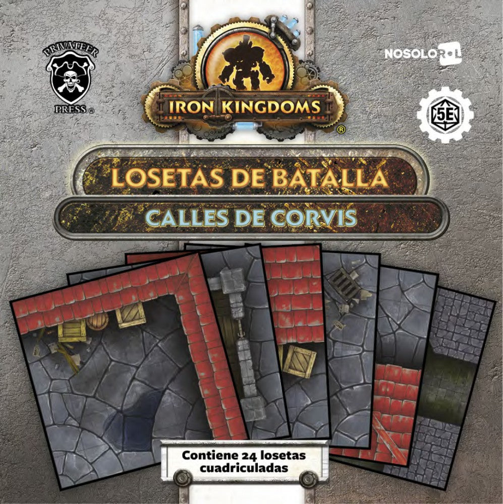 Iron Kingdoms - Losetas: Calles de Corvis contiene 24 losetas cuadriculadas de 6 x 6 pulgadas que cartografían el interior y el exterior de edificios y calles de Corvis en Iron Kingdoms, el entorno de campaña de 5E