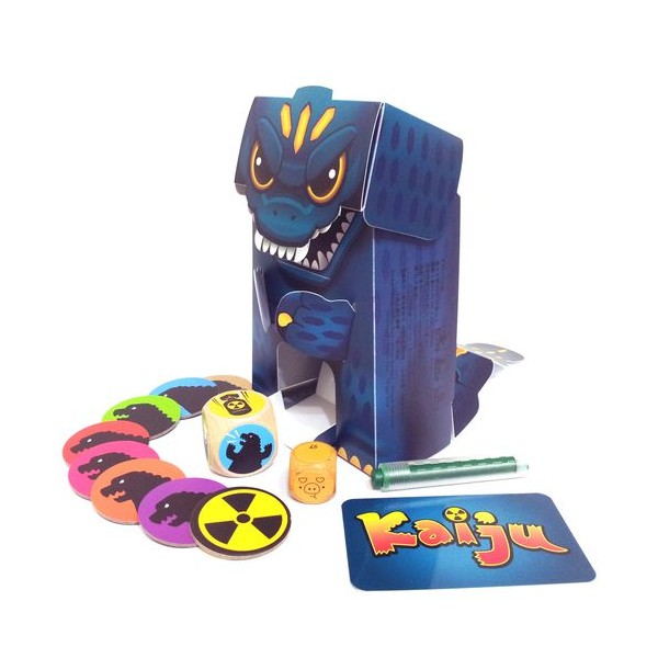 Kaiju is a fun party game in which players are the monsters in battle, and they roll a die and have to perform the action as quickly as possible. The slowest person gets a wound which is drawn on by the crayon marker, and the one who gets six wounds is out.