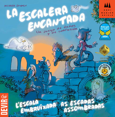 La Escalera Encantada es un juego espeluznante!. Se trata de una carrera en un viejo castilo en ruinas. Aquel que demuestre mas valor tiene todas las de ganar!. Hay un fantasma que vive arriba de las escaleras. Siendo muy cuidadosos, algunos niños valientes suben con cuidado y rapidez, todos desean ser el primero en llegar para asustar el fantasma con un “BOOOO!”. Pero el fantasma no es tonto y en secreto ha encantado los dados. Si los jugadores sacan un fantasma al tirarlos uno tras otro se transforman ellos mismos en fantasmas. Si un jugador saca un fantasma, puede poner una ficha de fantasma sobre el muñeco del otro jugador. ¡Un campo magnético mágico conecta a los dos y el muñeco desaparece! Ahora los jugadores deben recordar para el resto del juego debajo de qué fantasma está su propia figura. Si transforman a todos los jugadores y se saca en los dados otro fantasma, dos fantasmas pueden ser intercambiados. Quienquiera que llegue a lo alto de las escaleras en este caos gana!