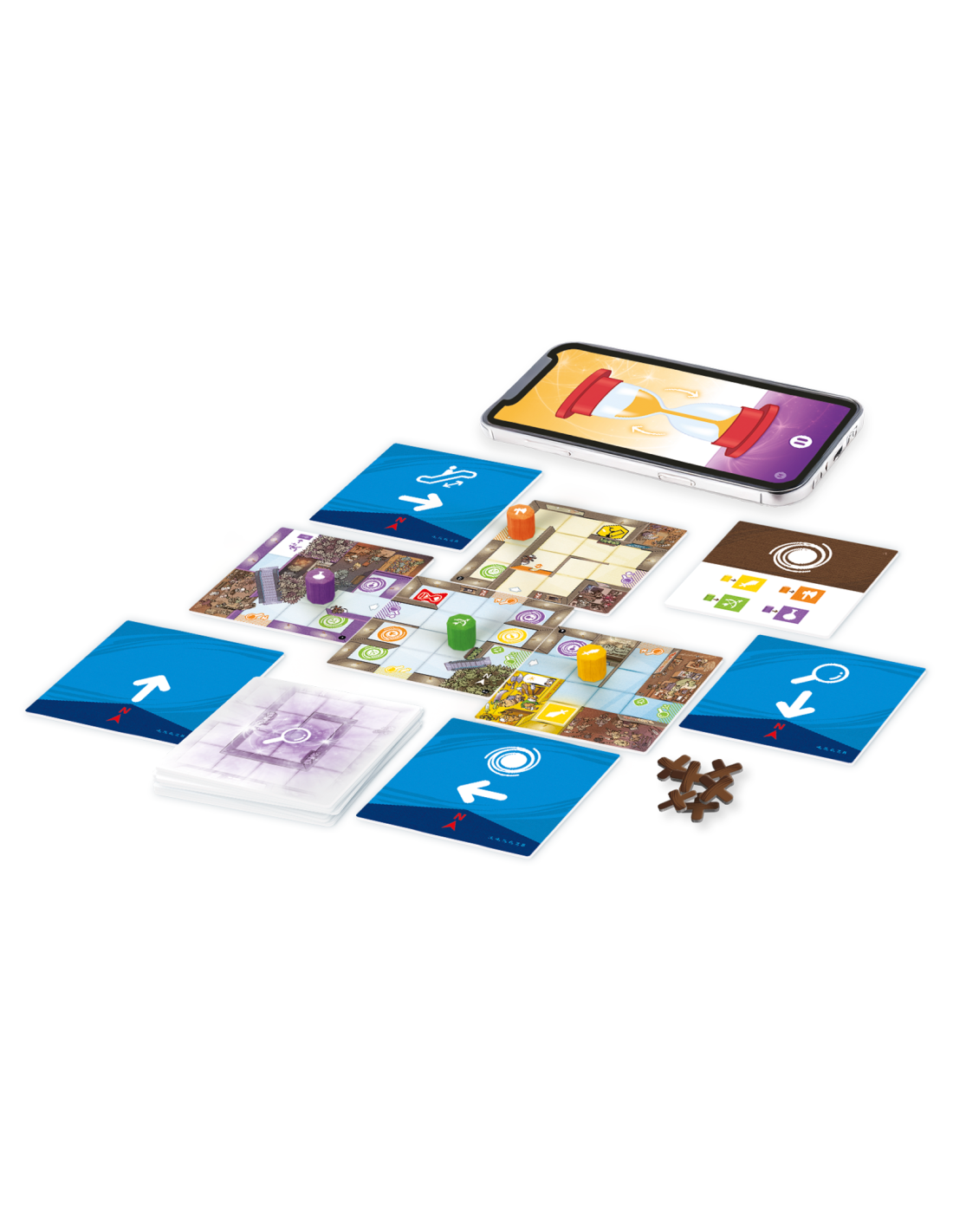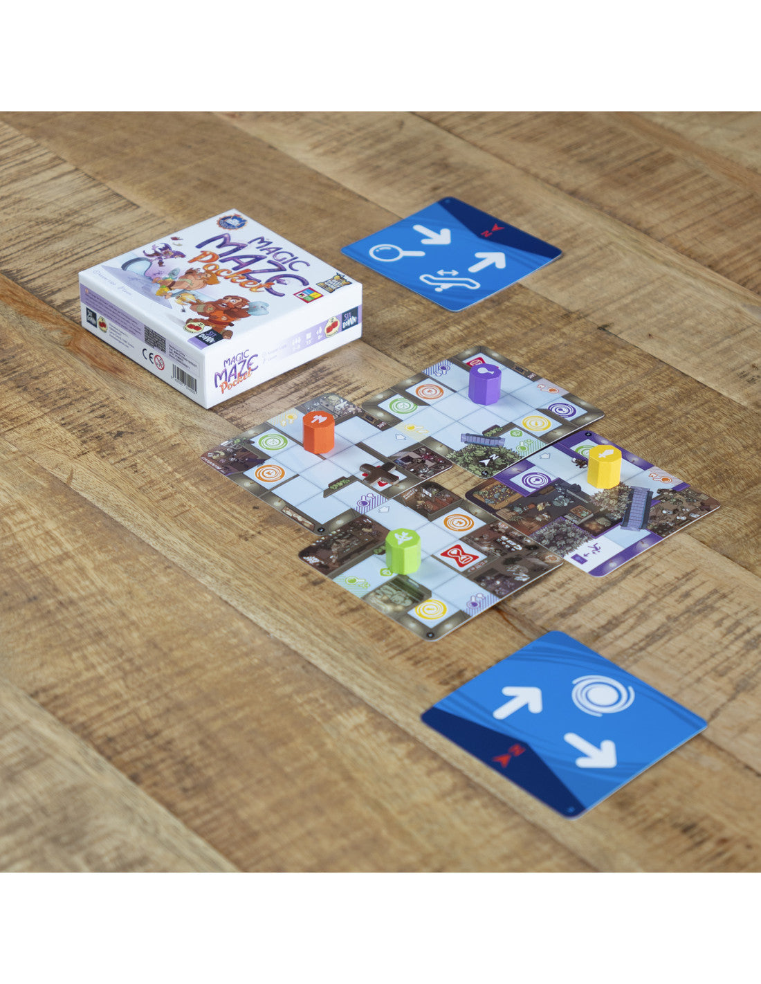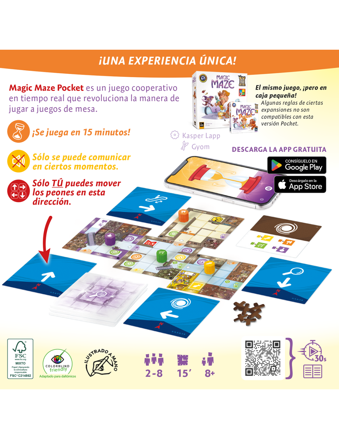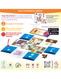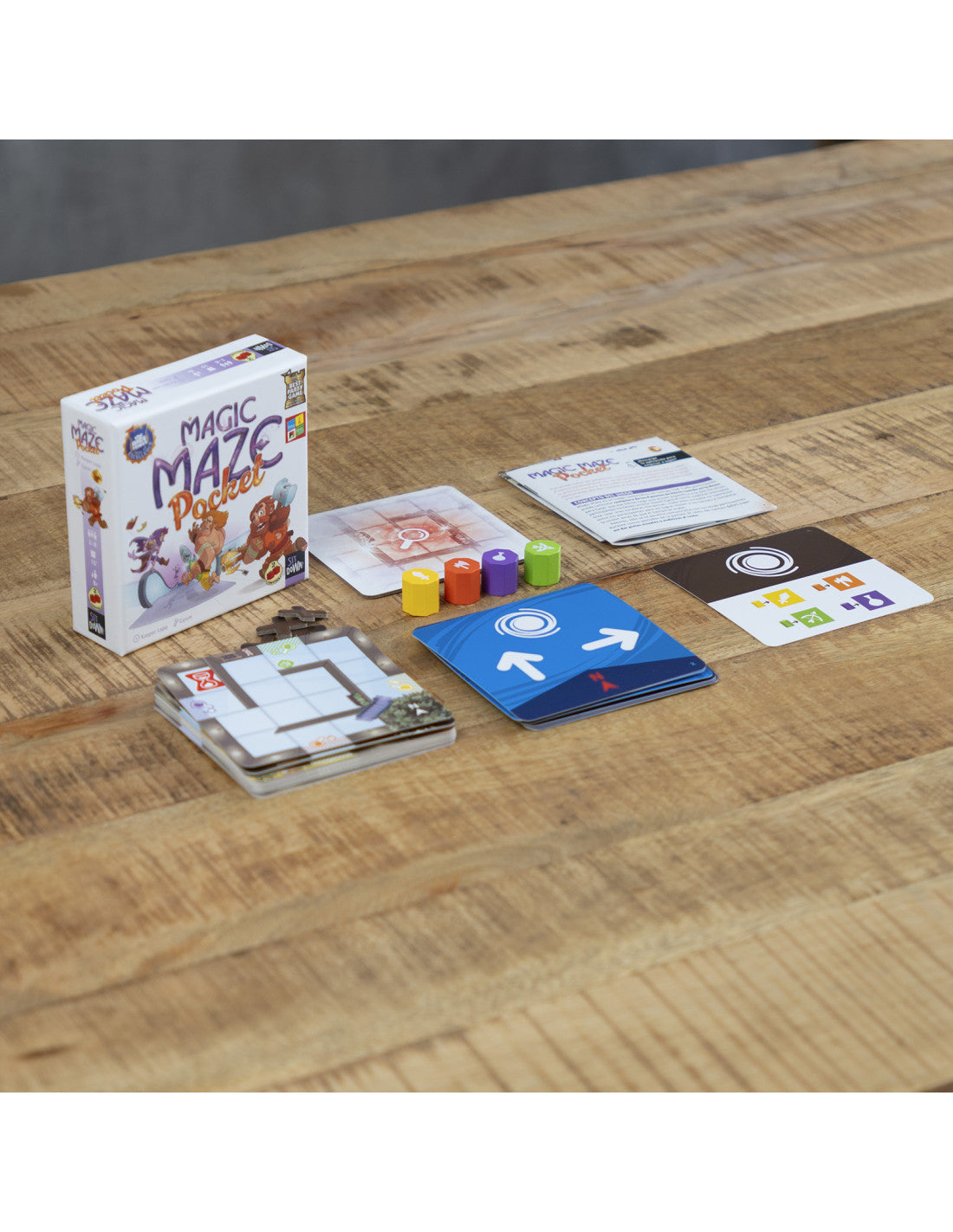 Magic Maze Pocket es la versión de bolsillo y económica de Magic Maze, ¡perfecta para llevarte la aventura a todas partes! Magic Maze Pocket es un juego cooperativo en tiempo real. Puedes controlar a cualquiera de los 4 peones héroe siempre que quieras para hacer que ese héroe realice una acción muy concreta, a la que los demás jugadores no tienen acceso: moverse hacia el norte, explorar una nueva zona, subir por una escalera mecánica... Tienes que completar tu misión antes de que se agote el reloj de arena. Además, solo se os permitirá comunicaros durante breves periodos de tiempo durante la partida. El resto del tiempo, tendréis que jugar sin daros señales visuales ni sonoras.