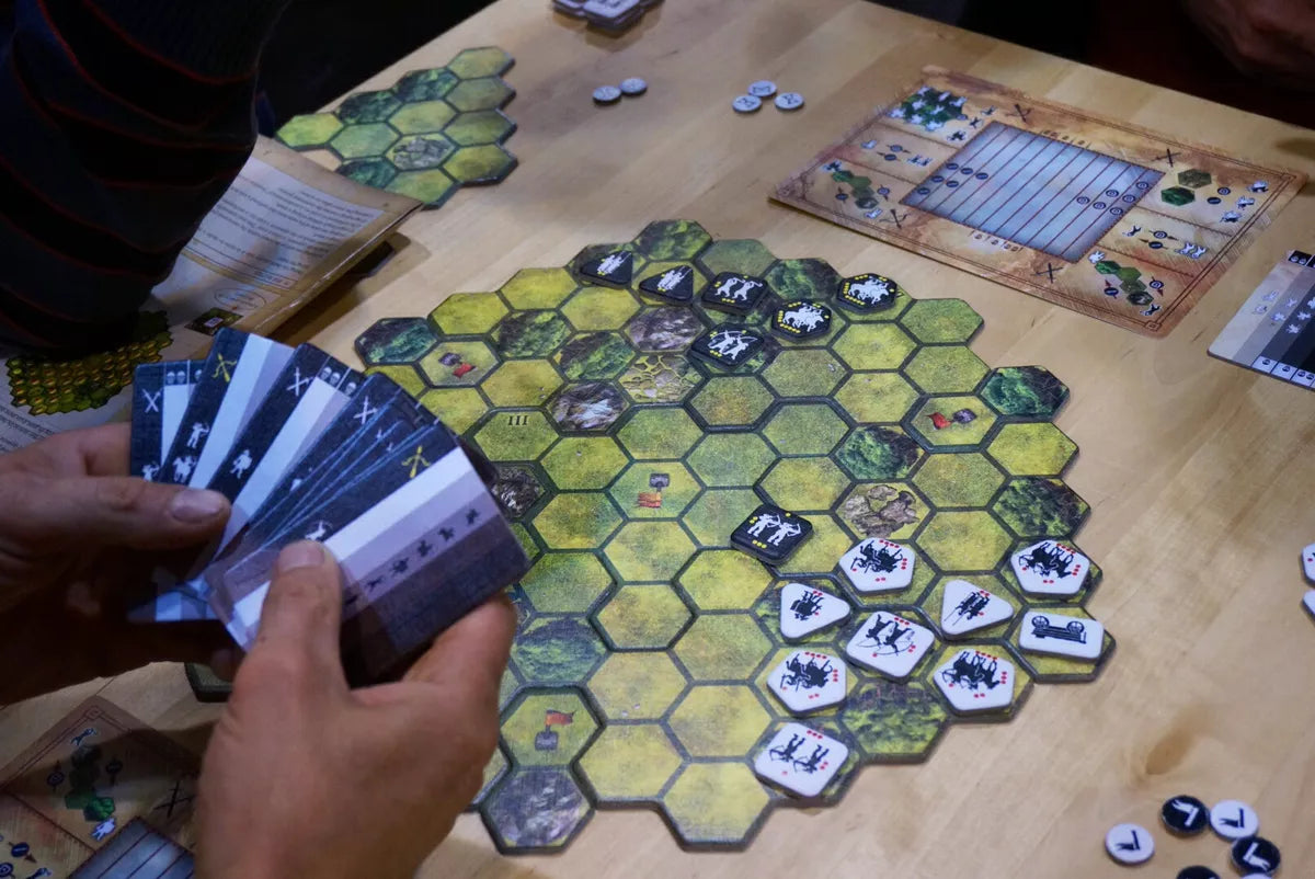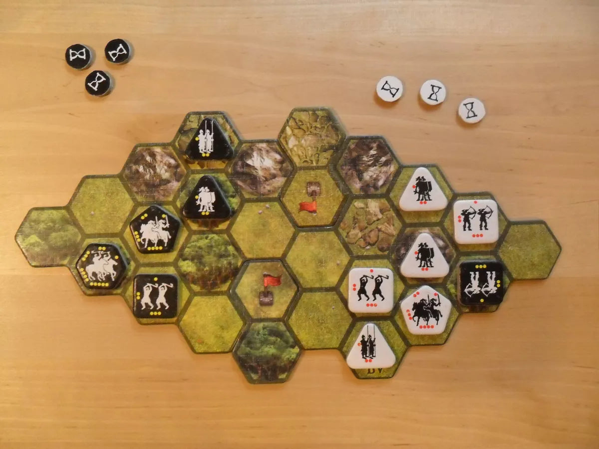 The unique system of combat results has no randomness. Players look for advantages and opportunities, attacking the enemy when it's too tired to run, for example, or claiming good terrain position. By using the power and mobility of his forces, a player tries to control more strategic points than his opponent and thereby win the game.