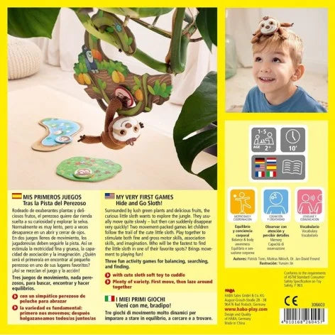 Mis primeros juegos: Tras la Pista del Perezoso es un juego de mesa para niños de Haba en donde  los niños y niñas deberán de encontrar al perezoso en alguno de sus lugares favoritos.