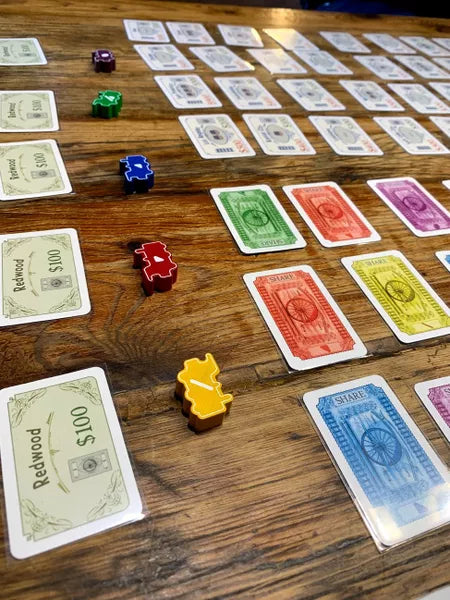 Componentes: 30 acciones (seis cartas en cada uno de los cinco colores de las compañías ferroviarias. 5 ciudades iniciales (con fondo oscurecido) 36 ciudades (con fondo blanco) 10 marcadores (dos en cada uno de los cinco colores de las compañías ferroviarias) Dinero (en billetes de $100, $200, $500 y $1000) 1 ficha de jugador inicial.