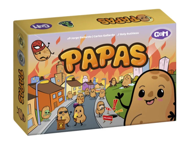 Papas es un juego de cartas en el que toda la familia se lo pasará en grande intentando juntar la mayor cantidad de Papas de Oro. Para esto tendrás que jugar papas para atacar o defenderte. ¿Te gustan unas buenas patatas fritas doradas y crujientes? ¡Pues prepárate para la fiebre patatera!