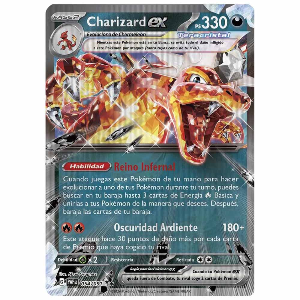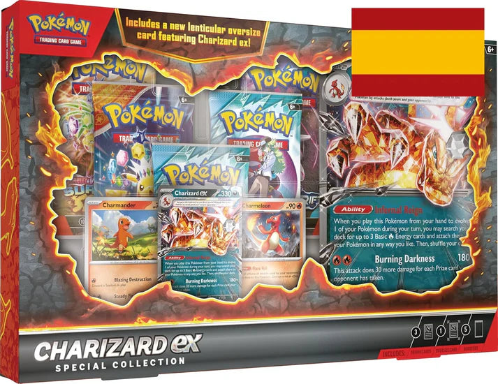 ¡Charizard ex calcinará la ventaja de tu rival recurriendo a la astuta potencia abrasadora de un Pokémon de tipo Oscuro! Hazlo evolucionar de Charmander y Charmeleon, utiliza la fuerza de su habilidad y ataca para lograr una rugiente remontada. Este bestial set llega con cinco sobres de mejora de JCC Pokémon y una carta de gran tamaño con efecto 3D del Pokémon Llama, impresa con tecnología lenticular para que, con solo moverla, ¡veas a Charizard ex lanzándose al ataque!