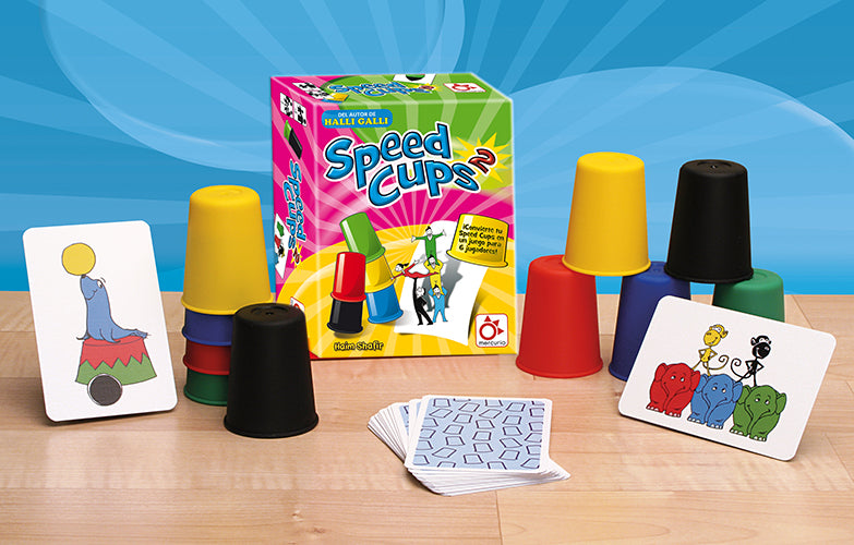 Idioma: Español Jugadores: 2-4 Duración: 15 min. Speed Cups 2 nos trae dos nuevos juegos de vasos para poder jugar a 2 jugadores ¡o a 6 jugadores si tenemos una copia de Speed Cups! Speed Cups pondrá a prueba tu habilidad y rapidez. Cada jugador tiene 5 cubiletes de colores y compite por completar el objetivo lo más rápido posible. ¡Hace falta tener buen ojo y reflejos! Las cartas muestran cómo se deben colocar los cubiletes... ¿Qué globo está más arriba, cuál debajo? ¿Los has colocado bien?, ¡pues corre a tocar el timbre! El jugador más rápido ganará la partida. También nos trae 19 cartas nuevas con un nuevo grado de complejidad y permite jugar a 2 jugadores o hasta 6 jugadores con una copia del juego base Speed Cups. Página del juego en BGG