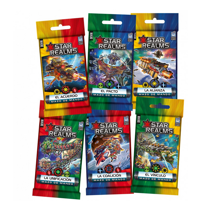 Mazos de Mando es la nueva expansión de Star Realms, el juego de construcción de mazos de bolsillo de batallas espaciales. Esta nueva expansión se conforma por seis sobres distintos. Cada uno de ellos incluye un mazo inicial único, con cartas de dos facciones, que sustituirá tu mazo inicial standard dando mayor variabilidad a tus partidas de Star Realms.