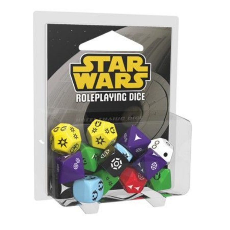 El sistema único de dados personalizados proporciona una enorme cantidad de opciones narrativas. ¡En los dados hay directamente impresos símbolos de éxito, fracaso y complicaciones! Incluso una tirada superada con éxito puede ponerte en peligro, y hasta un fracaso puede proporcionarte alguna ventaja. El blister de dados especiales de Star Wars: El juego de rol contiene catorce de estos dados para que podáis determinar rápidamente el éxito o fracaso de las acciones de vuestros personajes en el juego, al tiempo que enriquecen la narrativa de la historia con Ventajas y Amenazas.