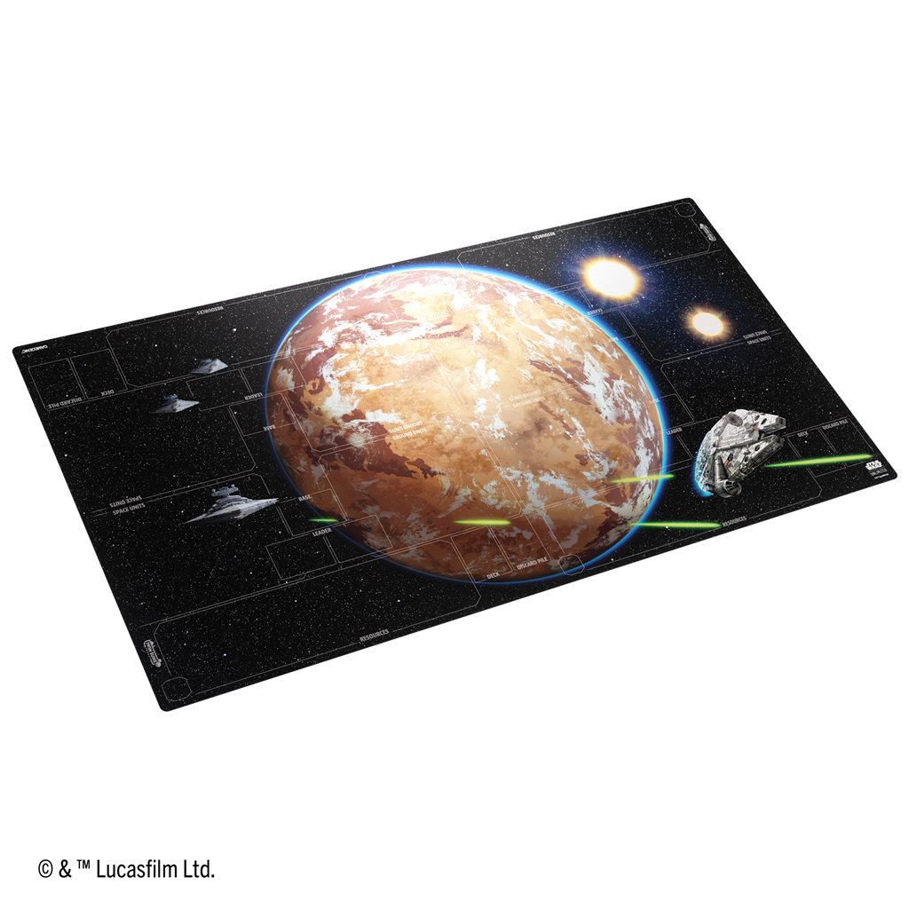 Este tapete para la zona de combate de gran tamaño y gran calidad, impreso a todo color y oficial de Star Wars™: Unlimited es el accesorio indispensable para los fans del formato TWIN SUNS.