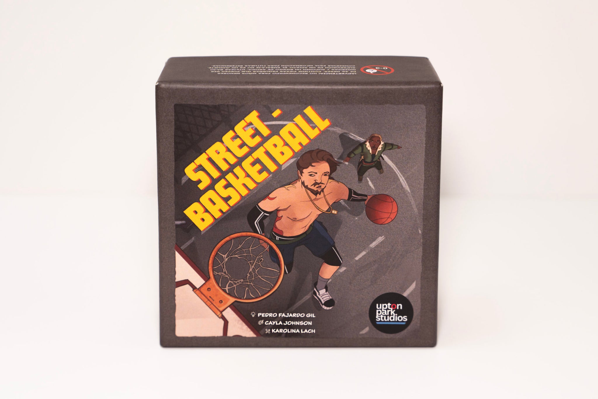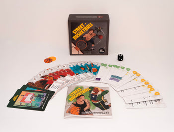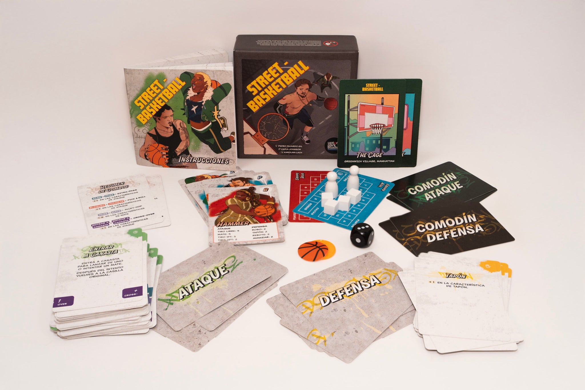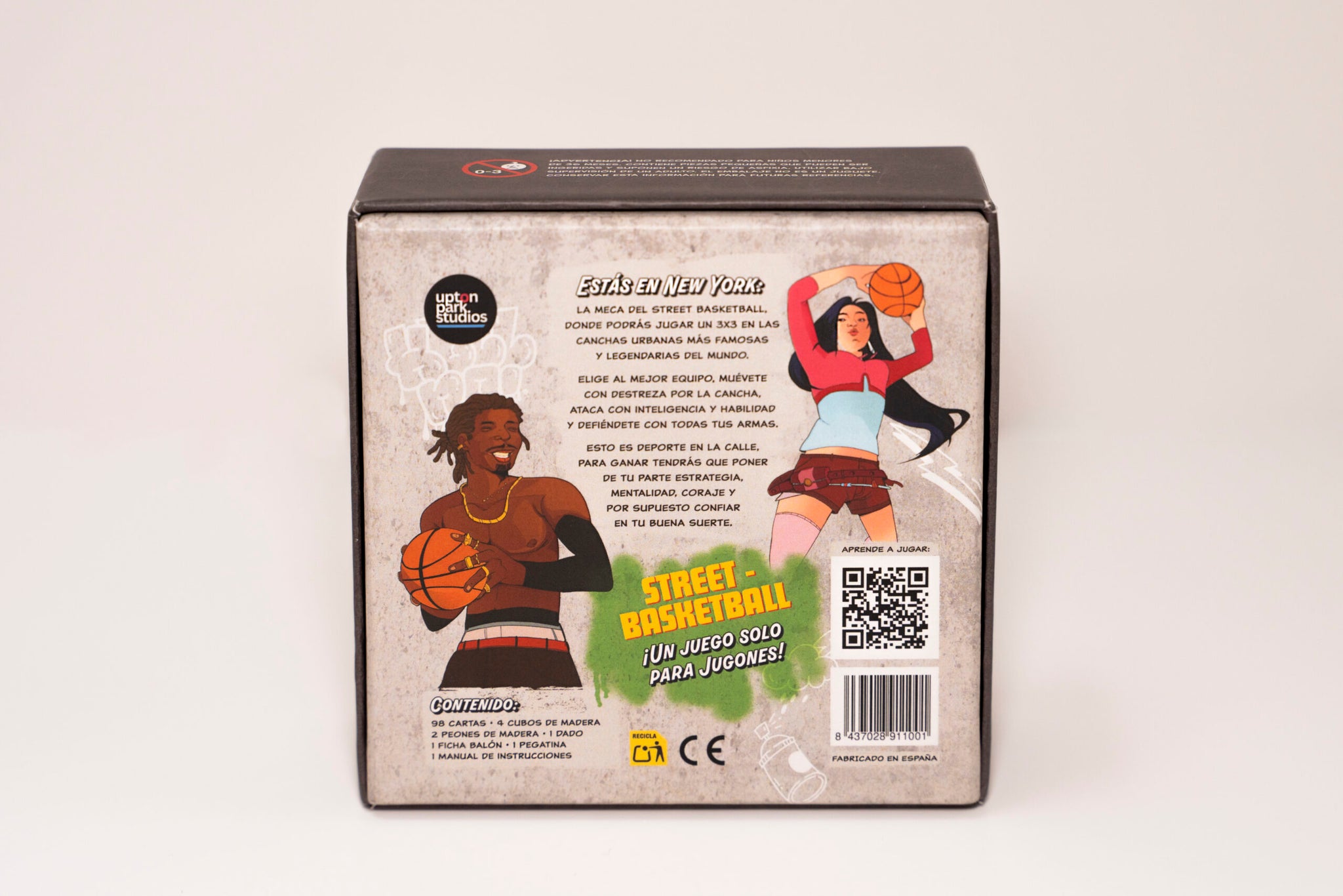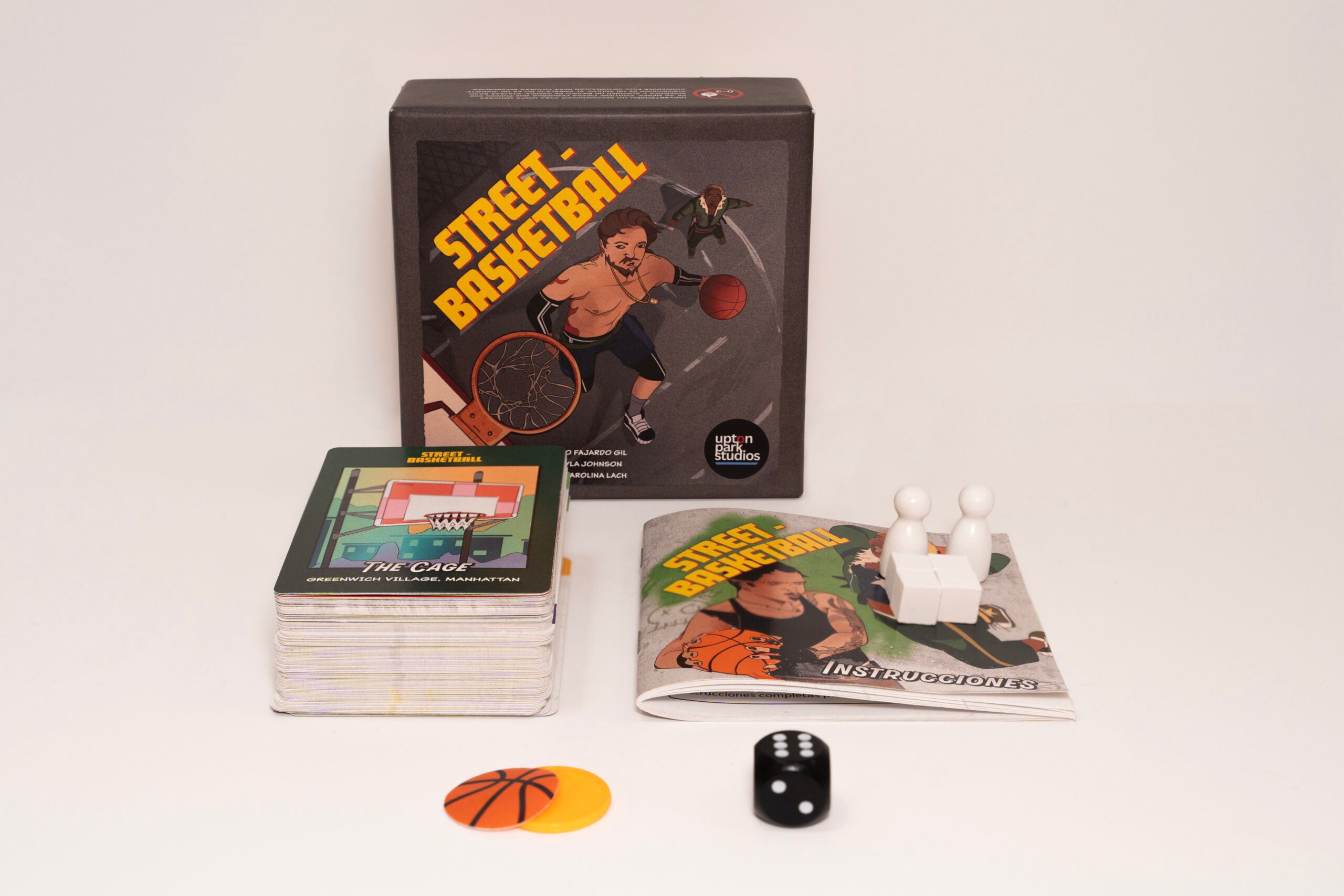 Street-Basketball captura la esencia del baloncesto urbano. Incluye 98 cartas, 4 cubos de madera, 2 peones, 1 ficha balón y 1 dado. Además, está ilustrado por artistas de New York y editado por Upton Park Studios.