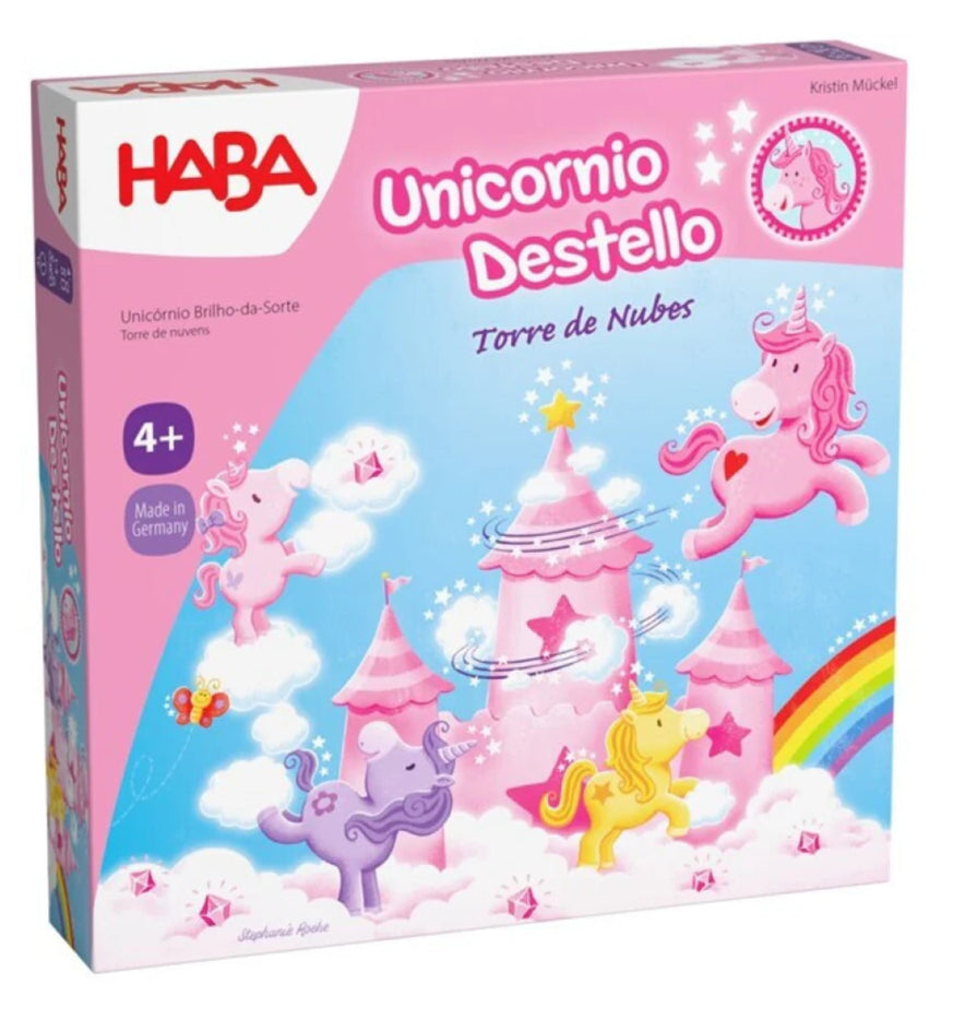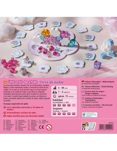 CONTENIDO: 4 unicornios: Destello (rosa), Polvo Interestelar (amarillo), Flor de las Maravillas (lila) y Vorágine Mágica (turquesa), 1 unicornio pequeño, Rosalie (rosa), 1 castillo de nubes, 5 nubes blancas y 5 nubes de color azul de madera, 1 dado, 1 tablero en forma de nube, 16 fichas nube, 10 cristales de nubes, 1 instrucciones del juego.